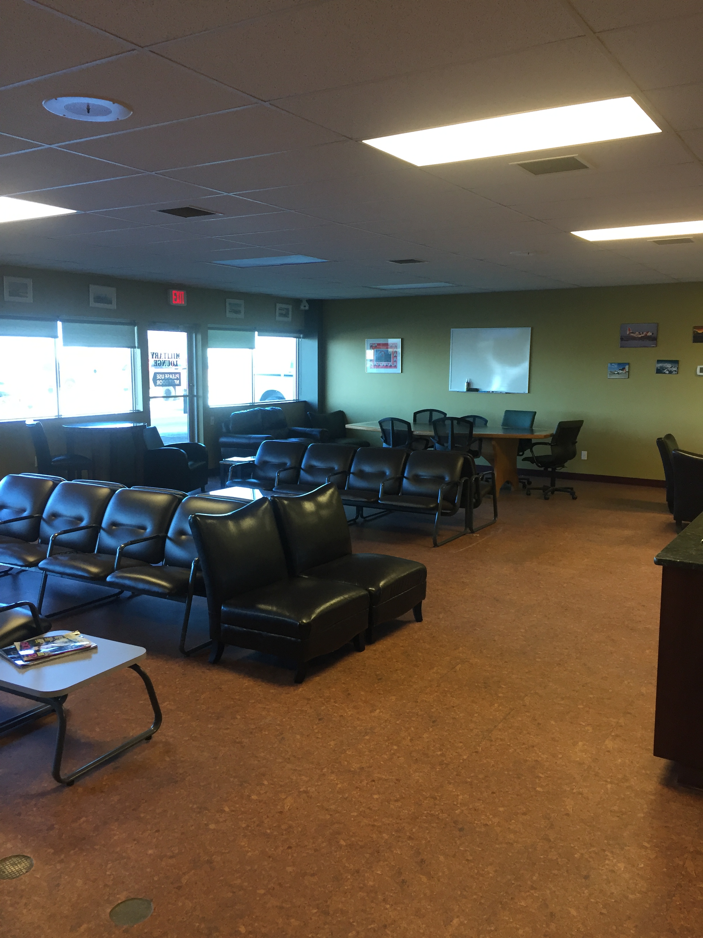 - Large windows with view of the runway